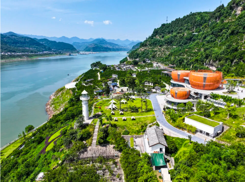 這是2024年5月15日拍攝的重慶萬州小桔燈生態文化旅游區及長江景象(無人機照片)。新華社記者 王全超 攝
