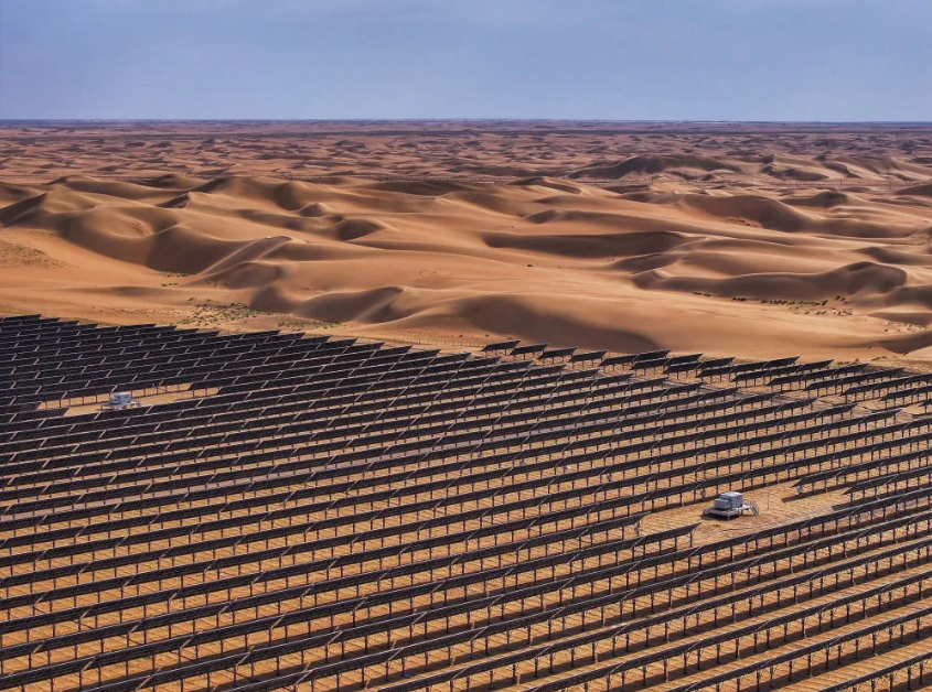 這是2025年6月5日拍攝的位于內蒙古巴彥淖爾市磴口縣的烏蘭布和東北部新能源基地100萬千瓦光伏先導工程項目(無人機照片)。該項目地處烏蘭布和沙漠。新華社記者 連振 攝